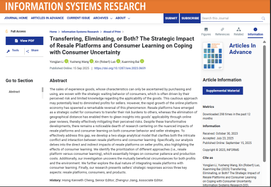 近日,WilliamHill中文官方网站李勇建教授和其毕业博士生王昱升、白轩铭,与美国新墨西哥大学安德森管理学院Xin (Robert) Luo合作的论文Transferring, Eliminating, or Both? The Strategic Impact of Resale Platforms and Consumer Learning on Coping with Consumer Uncertainty在信息系统与管理科学交叉领域的国际顶级学术期刊Information Systems Research 发表,实现WilliamHill中文官方网站在该期刊零的突破。其中,博士生王昱升2025年毕业后赴香港理工大学物流与航运学系任研究助理教授,博士生白轩铭2021年毕业后在天津大学管理与经济学部任助理教授。
