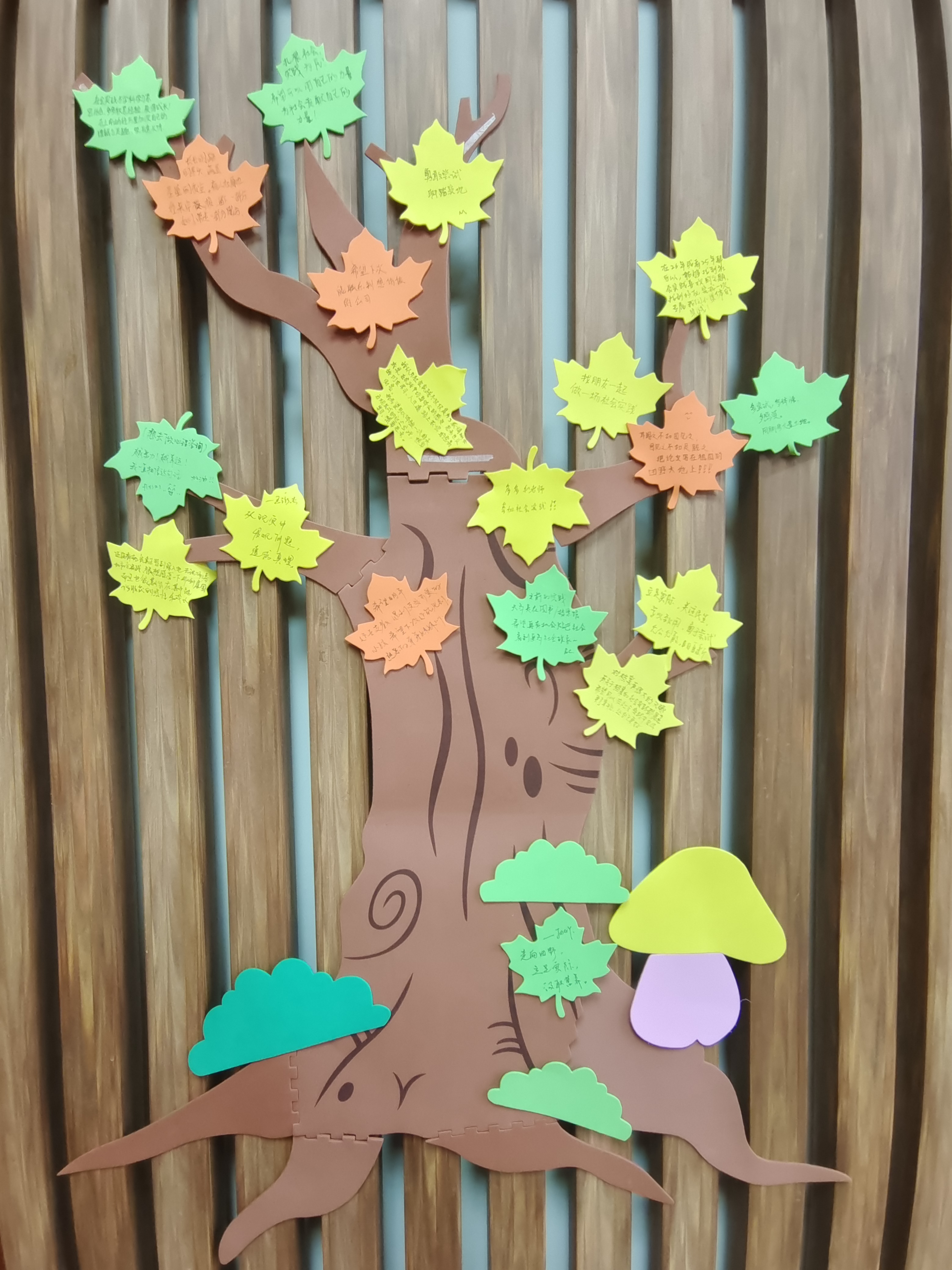 活动接近尾声时,全体学生参与“归音树”共育环节。新生与老生分别在特制的“枫叶”卡片上写下对未来社会实践的期待与感悟,随后将卡片贴于“归音树”展板上,最后汇聚成满满收获的“夏日实践拼图”。这棵“归音树”成为本次沙龙活动中同学们共同留下的珍贵纪念,实践精神就此得到传承与延续,并将伴随同学们在未来不断成长壮大。