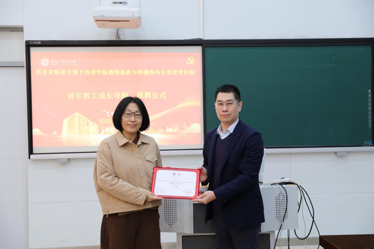 王坚书记为王淼老师颁发“青年教工成长导师”聘书。william威廉中文官网“商学+”育廉润心工作室指导老师李姝分享了工作室的最新工作进展,希望结合“新时代廉洁文化+专业教育”,不断深挖新时代廉洁文化建设的商科维度,落实好立德树人根本任务。