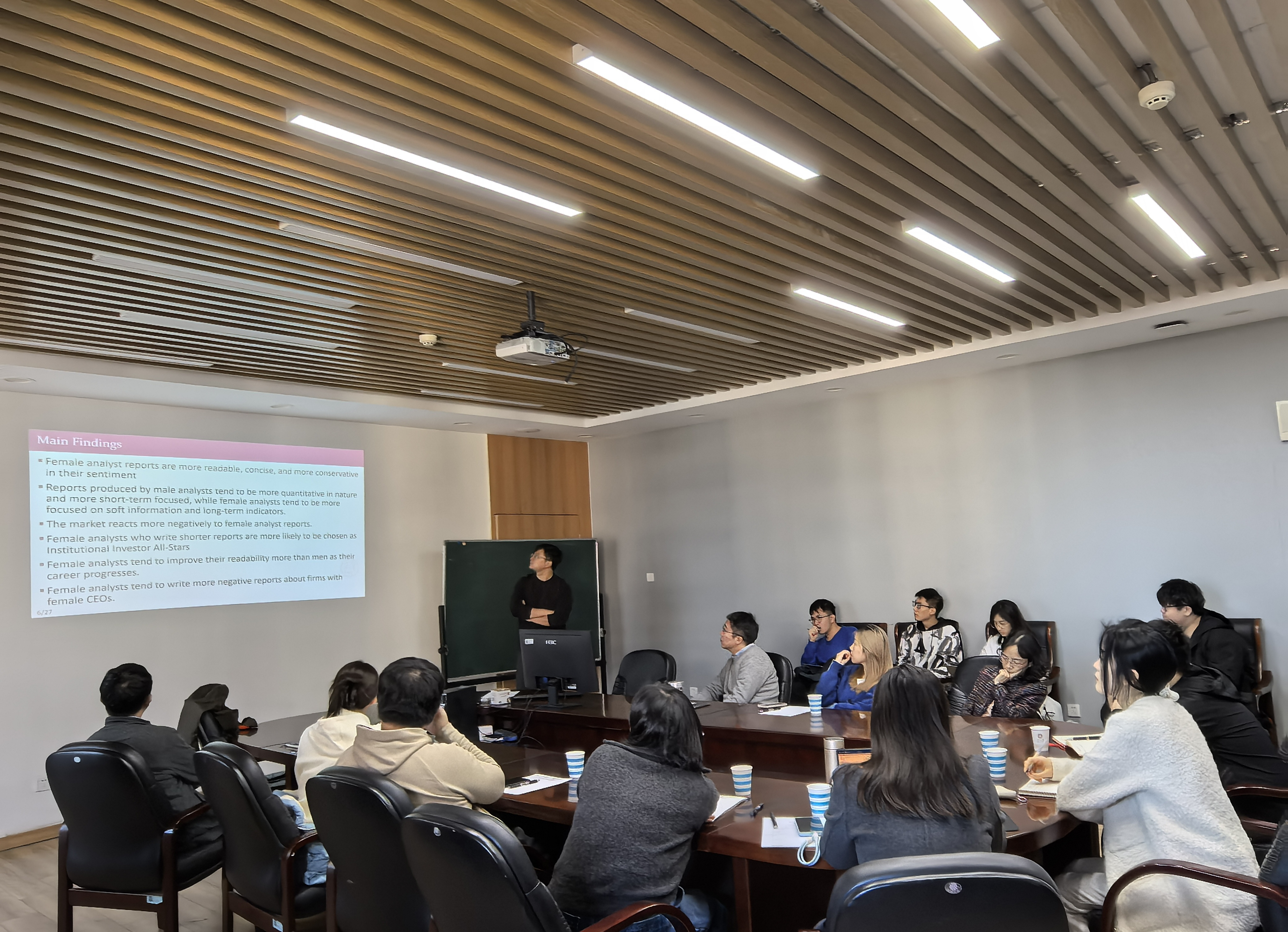 本次论坛邀请到财务管理系辛达奇老师分享相关研究成果,聚焦“Gender and Analyst Reports”,探讨了证券分析师群体在研究报告撰写、市场反应与职业发展方面的性别差异。