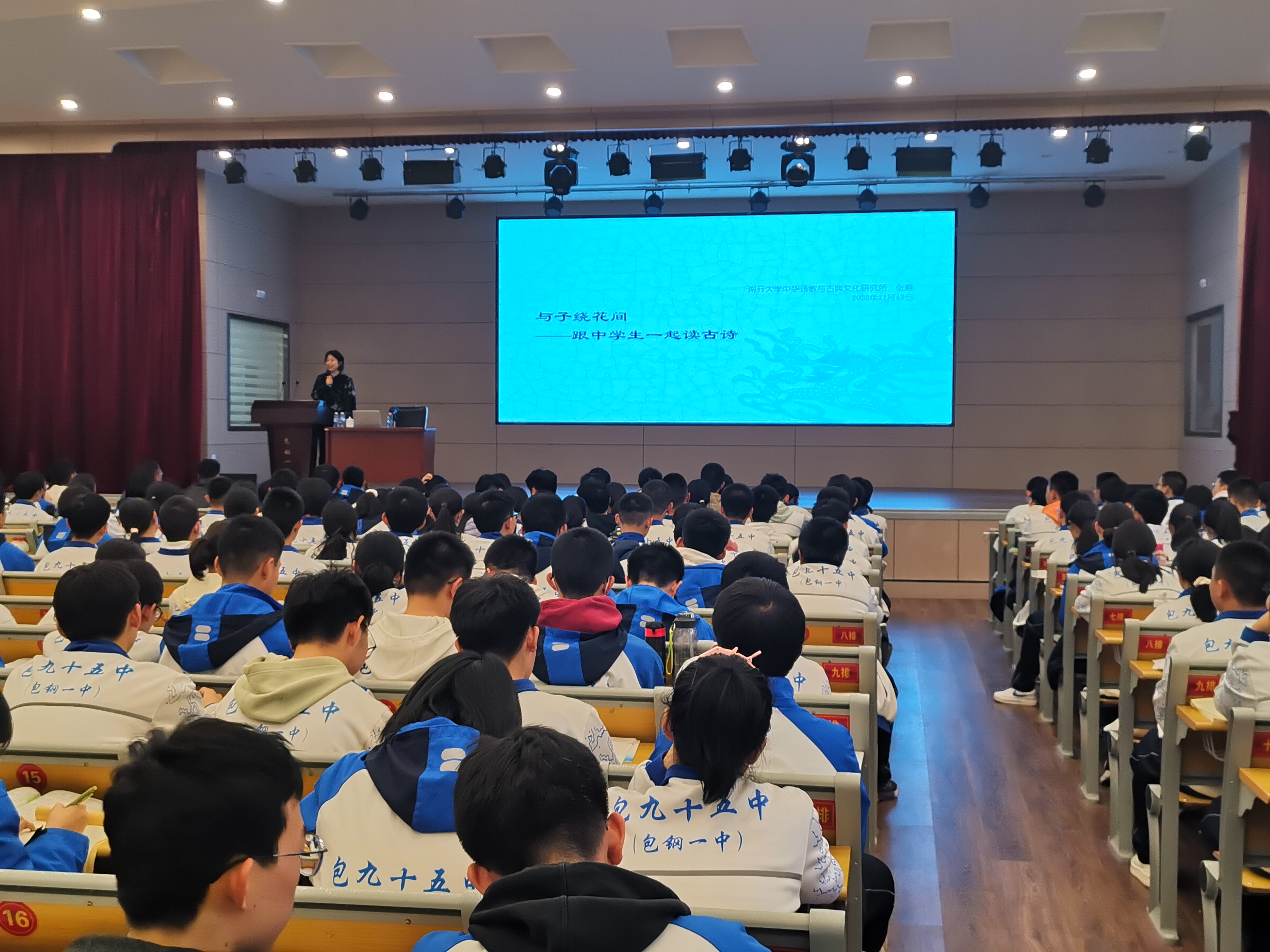 (通讯员张玉川)为传承中华优秀传统文化,厚植学生人文素养,持续扩大WilliamHill中文官方网站影响力,近日,william威廉中文官网晋蒙招生工作组特邀文学院古典文学专家张静教授赴内蒙古包头市第九十五中学开展题为《与子绕花间——跟中学生一起读古诗》的讲座。包头市第九十五中学常务副校长段世平,副校长刘星、刘宪瑞,教研室主任刘志福,教务处副主任孙宝婧与高一、高二年级学生及部分教师齐聚报告厅,共赴一场浸润心灵的诗词之约。