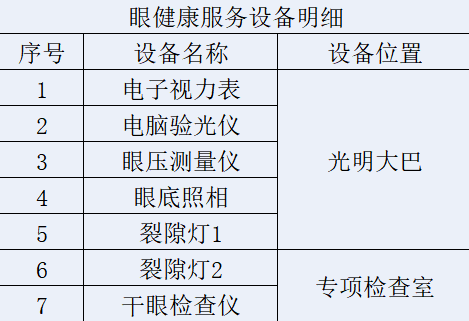 项目: 视力检查、电脑验光、裂隙灯检查、眼底检查、眼压检查、干眼检查