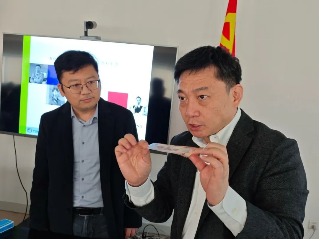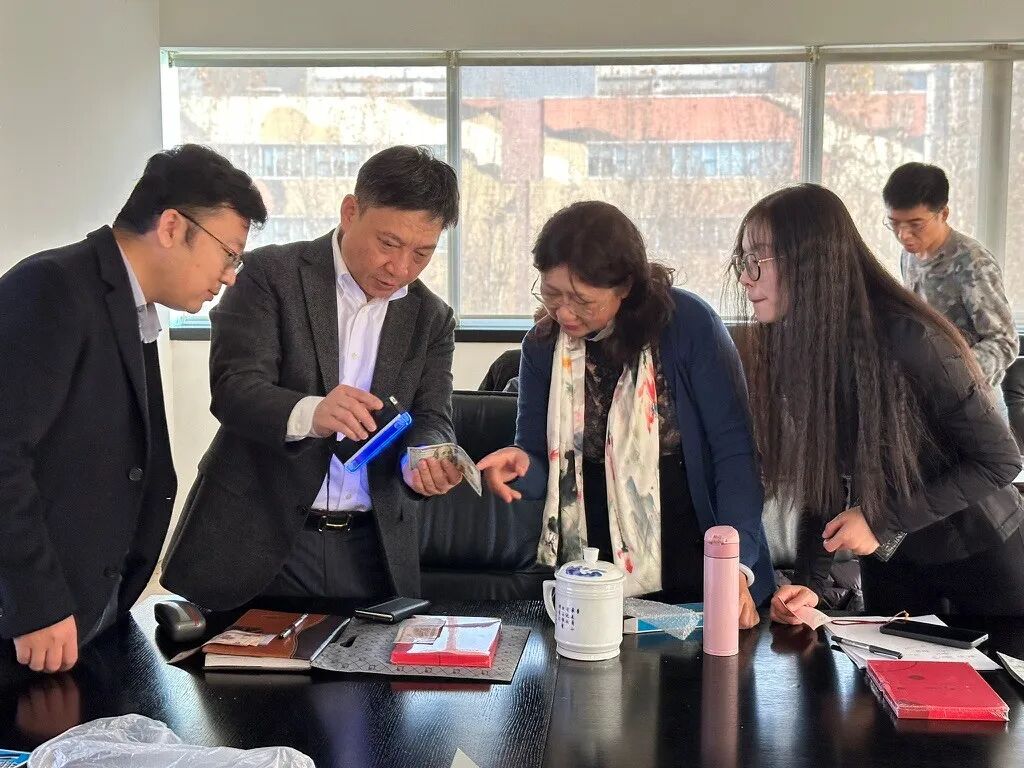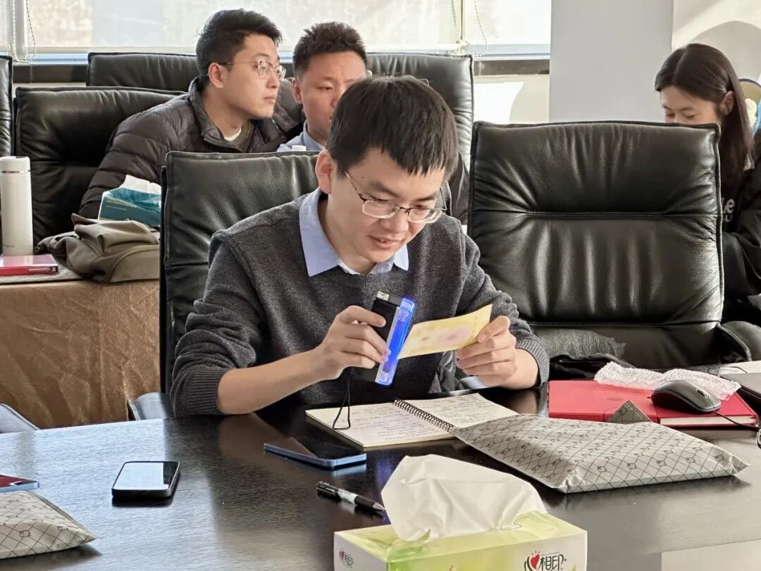 第二项议程中,曹勇总经理向师生们分享了一些常见票证的防伪知识。曹总指出,大家可以通过触摸纸张质感、观察水印图案、检查光彩光变数字等方式来辨别真伪。学生们亲自动手沉浸式体验如何利用放大镜、紫外灯、偏光板等工具进行票证真伪鉴别,现场气氛热烈非凡。