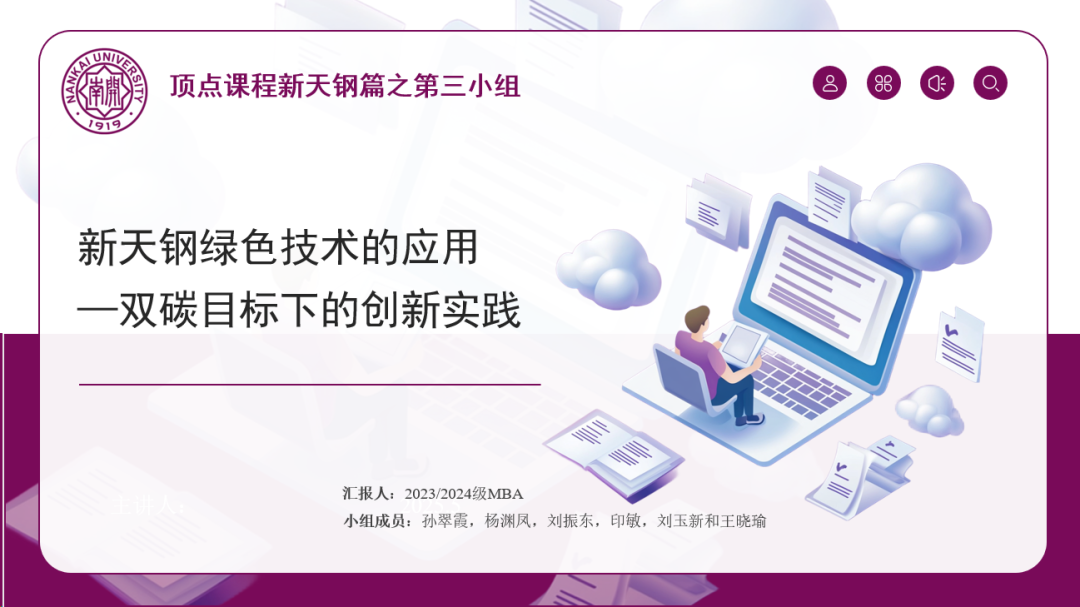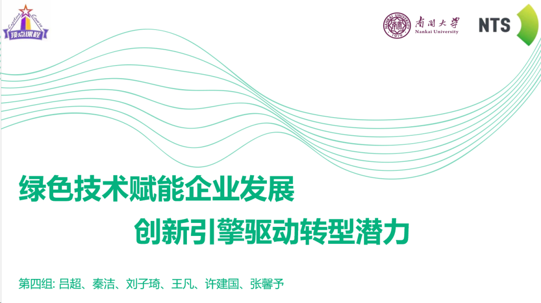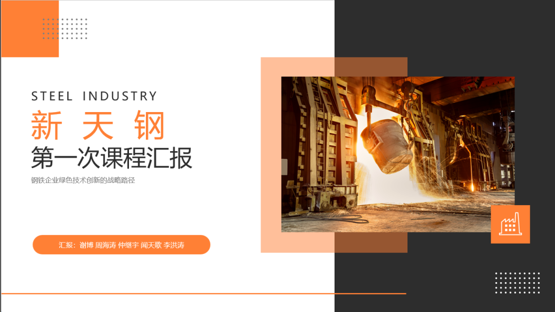 第四组(成员:吕超、秦洁、刘子琦、王凡、许建国、张馨予)以“绿色技术赋能企业发展,创新引擎驱动转型潜力”为题,从“双碳”目标的挑战与机遇、新天钢的绿色技术应用、创新与“绿色”双擎发展、绿色技术的价值与创造等4个方面进行汇报。首先,解释了“双碳”目标的含义,并分析了其对中国钢铁行业的深远影响,包括能源结构调整和技术瓶颈等问题;然后,通过新天钢的案例,详细介绍了长流程与短流程炼钢的特点及其绿色转型策略,强调清洁生产技术和烟气治理的重要性;其次,讨论了创新与绿色发展的相互关系,提出绿色技术创新涵盖工艺改进和产品创新两个方面。最后,通过展示新天钢在绿色钢材开发及应用上的成就,如采用超低排放改造和氢冶金技术等,体现了绿色技术在提升产品质量、降低成本、满足市场需求方面的巨大潜力。这为企业提供了一条实现可持续发展与经济效益双赢的道路。