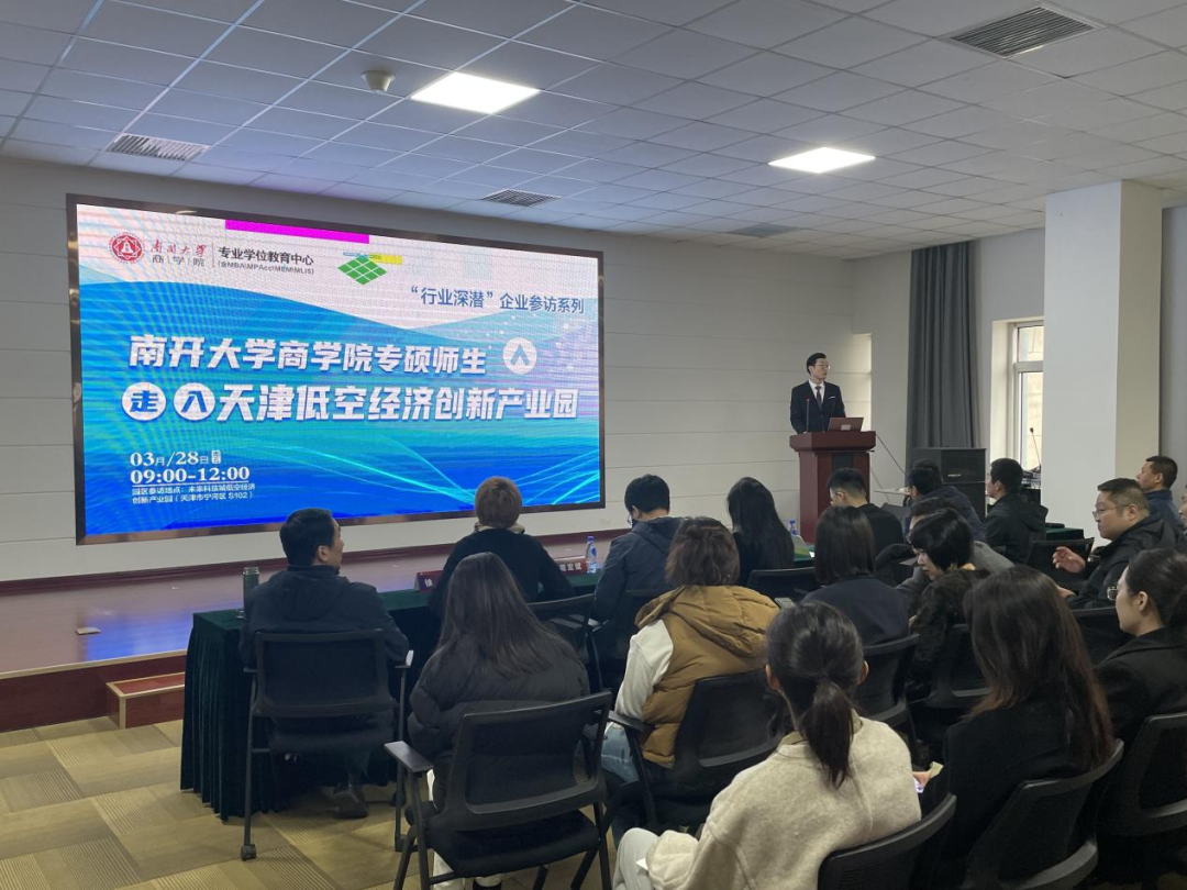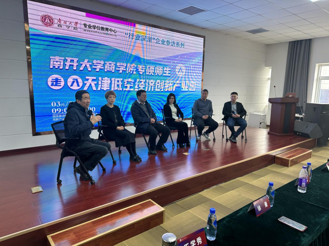 参观结束后,师生们进入会议室,天津低空经济发展有限公司副总经理刘建涛先生对大家的到来表示欢迎。随后,刘总在产业园报告厅为师生们详细介绍了低空经济发展中的应用场景、政策支持、技术突破、面临的问题及未来方向等内容,分享了他心目中的“低空经济产业图景”。
