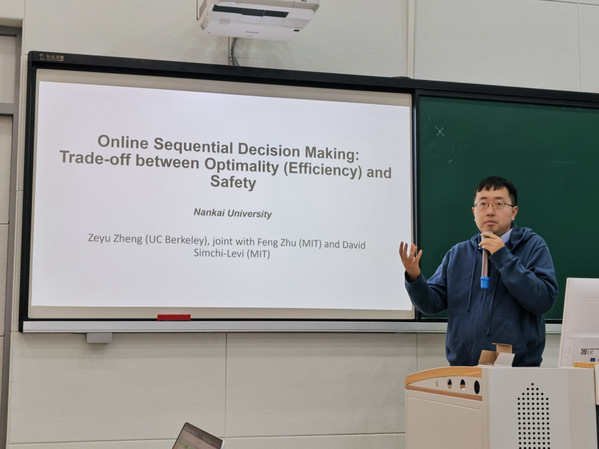 (通讯员:陆怿)2024年12月16日,william威廉中文官网管理科学与工程系特别邀请加州大学伯克利工业工程与运筹系的郑泽宇教授,举办了一场主题为“Sequential decision making: trade-off between optimality and safety”的学术讲座,吸引了管科系的硕士生和博士生积极参与。郑泽宇教授是加州大学伯克利工业工程与运筹系教授、获终身教职,并主持伯克利人工智能与仿真实验室,其研究领域集中在仿真、应用概率、机器学习、人工智能,在运筹学、管理科学期刊Operations Research,Management Science发表论文十余篇;在机器学习、人工智能会议NeurIPS, ICML, KDD, AISTATS发表论文十余篇。郑泽宇教授现担任Operations Research、Naval Research Logistics等期刊Associate Editor。讲座中,郑泽宇教授详细介绍了其关于顺序决策中效率与安全性之间权衡的一项研究。以往的研究大多集中于顺序决策的“最优化”问题,旨在通过最小化后悔期(regret)期望来实现效率。然而,在关