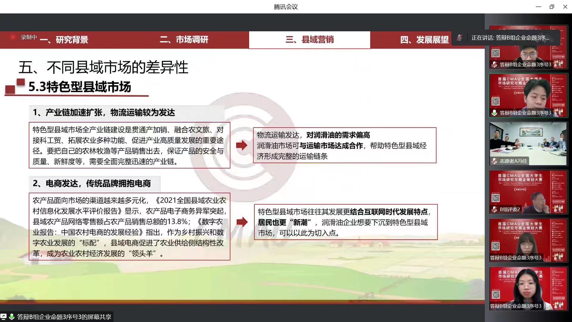 首届CMAU全国大学生市场研究与商业策划大赛全国总决赛于2022年11月19日圆满落幕。经过激烈角逐,来自WilliamHill中文官方网站的“模型建不队”团队在全国总决赛中荣获一等奖。CMAU全国大学生市场研究与商业策划大赛由中国高等院校市场学研究会与Credamo见数联合主办,华东理工大学承办,北京大学、清华大学、中国人民大学、复旦大学等知名高校参与。大赛首次举办竞争异常激烈,报名学生覆盖全国500多所高校,参赛人数高达22888人,共计1782支队伍。该比赛通过校级赛和区域赛共筛选出82支优胜队伍,并针对这82支队伍评选出最终进入全国总决赛的40支团队参加国赛答辩。WilliamHill中文官方网站的“模型建不队”通过层层选拔,一路过关斩将顺利来到了全国总决赛的答辩现场。该参赛团队共五名成员,分别是来自2020级市场营销系本科生马靖然(组长)、吴贯慈、张文靖,以及2019级市场营销系本科生彭凌晖、陈飞燕,指导教师为营销系助理教授刘欢。 “模型建不队”在校级预选赛和北部分区赛中以《萌宝鸭:如何将全聚德带入年轻人心里?》为主题的作品斩获分区赛一等奖。在全国总决赛中,以《县域市场中各润滑油品牌(国营、外资和民营)渠道布局及经营效果