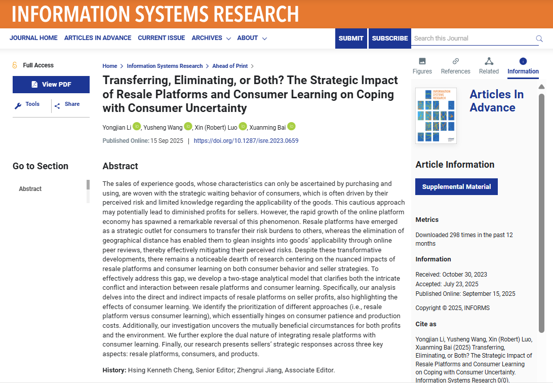 近日,WilliamHill中文官方网站李勇建教授和其毕业博士生王昱升、白轩铭,与美国新墨西哥大学安德森管理学院Xin (Robert) Luo合作的论文Transferring, Eliminating, or Both? The Strategic Impact of Resale Platforms and Consumer Learning on Coping with Consumer Uncertainty在信息系统与管理科学交叉领域的国际顶级学术期刊Information Systems Research发表,实现WilliamHill中文官方网站在该期刊零的突破。其中,博士生王昱升2025年毕业后赴香港理工大学物流与航运学系任研究助理教授,博士生白轩铭2021年毕业后在天津大学管理与经济学部任助理教授。本研究聚焦企业对于消费者不确定性的应对策略,并首次剖析转移与消除手段对于企业利润与环境影响的内在影响机制。一直以来,经验商品的特性只能通过购买和使用来确定,其销售与消费者的策略等待行为交织在一起,这种等待行为通常是由消费者感知到的风险和对商品适用性的有限了解驱动的。这种谨慎的做法可能导致卖方的利润减少。然而,网