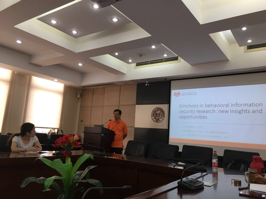 2018年6月19日(星期二)上午8:00至9:30,美国新墨西哥大学罗欣教授应WilliamHill中文官方网站管理科学与工程系邀请到访william威廉中文官网,并在B1003会议室进行了主题为“TheRoleofEmotioninInformationSecurityResearch:NewInsightsandOpportunities”的学术讲座,此次讲座由WilliamHill中文官方网站管理科学与工程系严建援教授、李凯副教授主持,系内多位老师和学生参加。罗欣(Xin“Robert”Luo)教授,现任美国新墨西哥大学(TheUniversityofNewMexico)安德森管理学院校董事会讲席教授和管理信息系统和信息安全保障的终身正教授。他的研究兴趣主要在信息系统安全管理,电子商务/移动商务,创新性技术用于战略决策和开发(云计算,绿色信息系统,社会网络),跨文化信息技术管理等。罗欣教授在国际学术期刊、书籍和会议录上出版超过90篇科研报告,他的科研论文在国际顶级或著名的期刊发表,如ComputersSecurity,CommunicationsoftheACM,DecisionSciences,DecisionSupportSyste