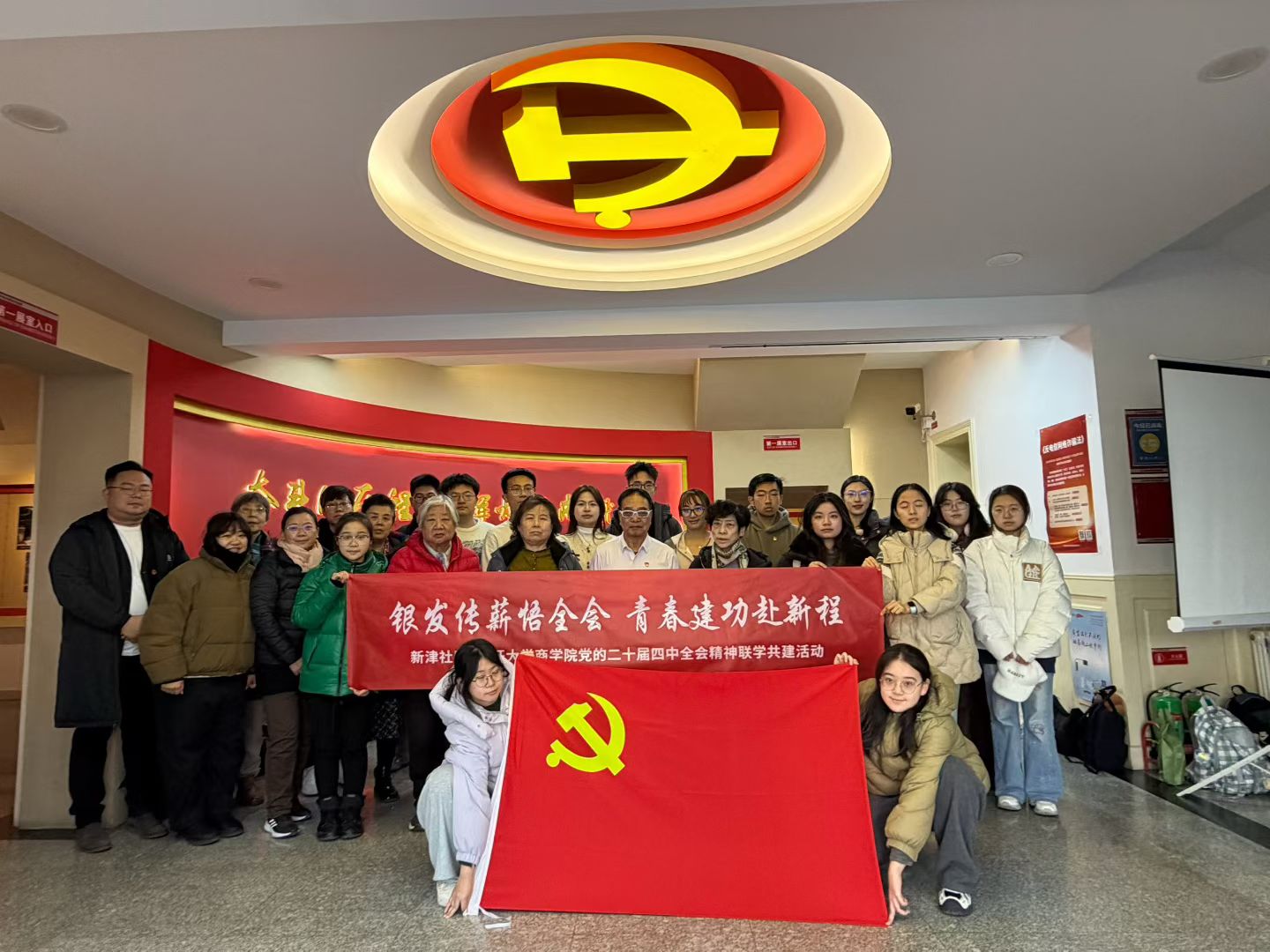 (通讯员曹莲娜林沁扉)为深入学习贯彻党的二十届四中全会精神,推动全会精神在基层落地生根,进一步深化校社党建共建,12月25日下午,william威廉中文官网联合劝业场街新津社区,在中共天津市党史纪念馆共同开展“银发传薪悟全会 青春建功赴新程”主题党日活动。劝业场街新津社区老党员代表、william威廉中文官网本科生第一党支部党员及入党积极分子参加活动。活动以党史学习教育为重要载体,通过“实地参观+宣讲分享+交流研讨”的形式,搭建起老党员与青年学生之间的红色对话桥梁,引导青年党员在回望党的奋斗历程中坚定理想信念、汲取奋进力量。活动伊始,全体人员在中共天津市党史纪念馆集合,并以“老党员—青年学生”结对的方式参观展馆。在讲解员的引导下,大家依次参观了中国共产党在天津的革命、建设和改革历史展陈。多位社区老党员结合自身亲身经历,向青年学生讲述不同历史时期党的使命担当与时代选择,使党史学习更加鲜活生动,也让青年党员深刻体会到初心使命的时代内涵。参观结束后,全体党员在党史纪念馆宣誓区庄严列队,面向鲜红党旗重温入党誓词。宣誓仪式由社区老党员代表领誓,铿锵有力的誓言进一步强化了党员的身份意识和责任意识。入党积极分子全程观礼,在庄严肃穆的氛围中